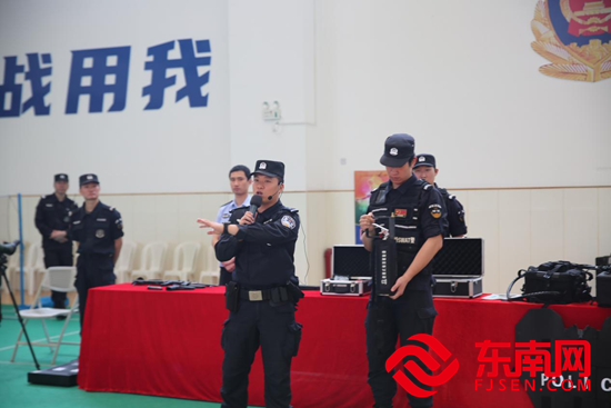 警官介紹警用裝備(東南網(wǎng)福清站記者 馮錦 攝)