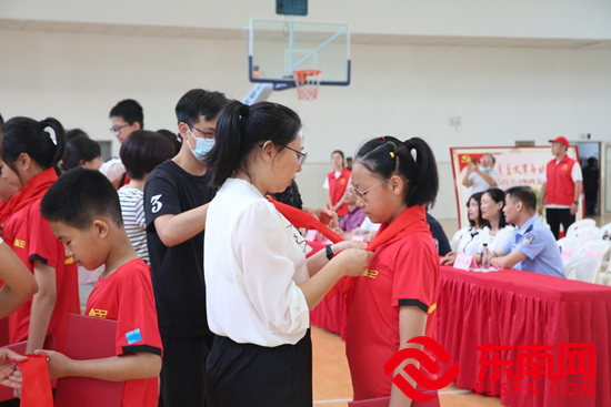 家長為孩子們系紅領(lǐng)巾(東南網(wǎng)福清站記者 馮錦 攝)