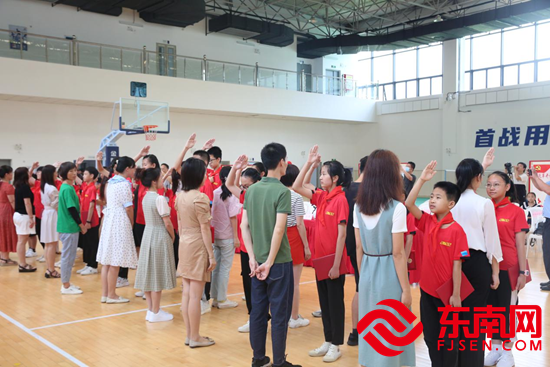 頒發(fā)證書后合影留念(東南網(wǎng)福清站記者 馮錦 攝) 在重溫入隊(duì)宣誓詞環(huán)節(jié),家長為孩子們戴上紅領(lǐng)巾。孩子們莊重地向家長們行少先隊(duì)隊(duì)禮。在領(lǐng)誓人的帶領(lǐng)下,孩子們鏗鏘有力的誓詞響徹場館上空。