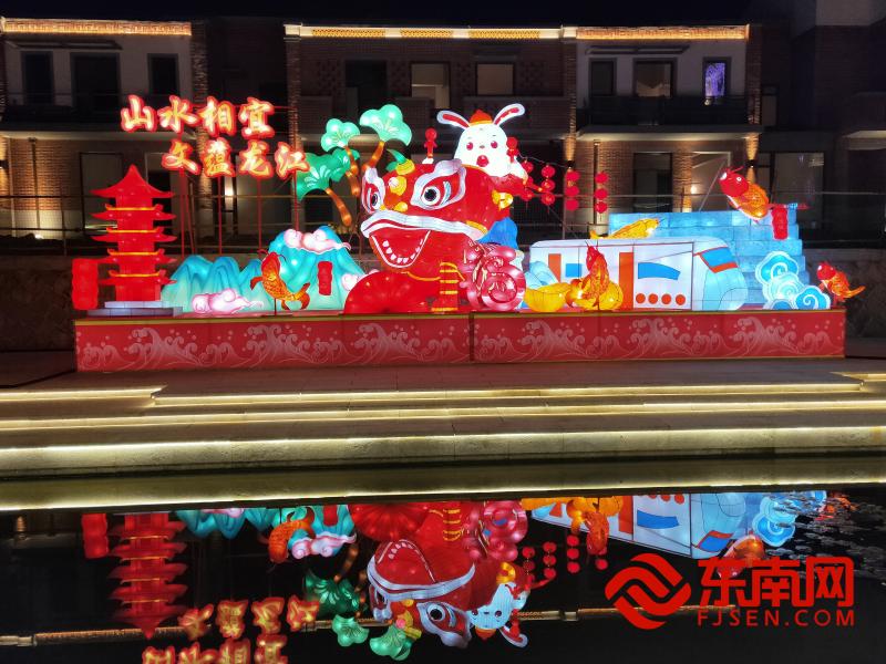 漁溪鎮(zhèn)燈組(東南網(wǎng)福清頻道元宵花燈采編組供圖) 從濱水公園南岸入口進(jìn)入,從主入口出來后過龍首橋就是南岸入口,正好形成一個(gè)閉環(huán),兩個(gè)區(qū)域隔江相望,可以說是此次元宵燈會(huì)能看到花燈數(shù)量最多的一片區(qū)域。這條路線可以沿途觀賞來自南嶺鎮(zhèn)、高山鎮(zhèn)、港頭鎮(zhèn)、江鏡鎮(zhèn)、龍?zhí)镦?zhèn)、城頭鎮(zhèn)、龍江街道、江陰鎮(zhèn)、海口鎮(zhèn)9個(gè)鎮(zhèn)街的元宵花燈。游客可以體驗(yàn)到立體全方位的觀賞效果,藝術(shù)感和視覺感官“直線UP”,花燈燈組與龍江夜色和古街老巷融為一體,錦上添花。