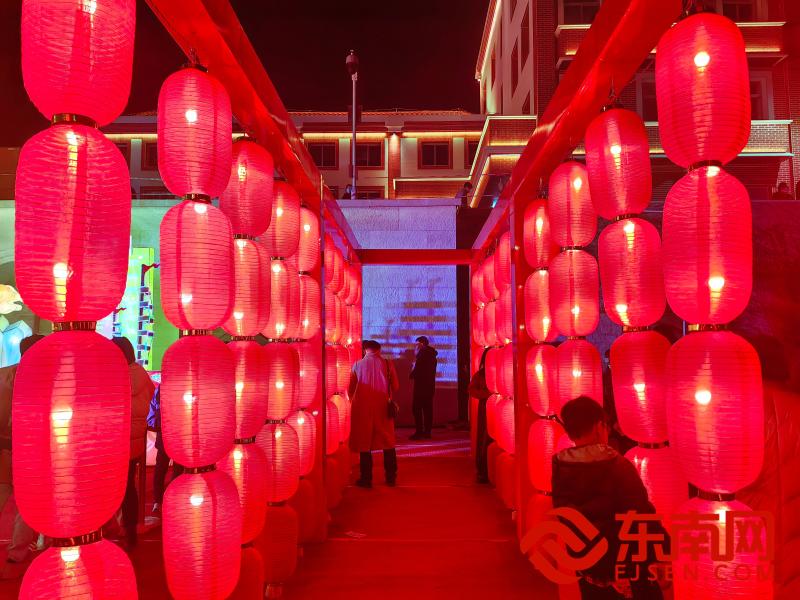 漁溪鎮(zhèn)花燈(東南網(wǎng)福清頻道元宵花燈采編組 攝) 漁溪花燈兩側框架內掛滿了紅色燈籠,映射出漁溪一路走來的過去悠遠豐饒,也為元宵增加喜慶色彩和節(jié)日歡樂氛圍。