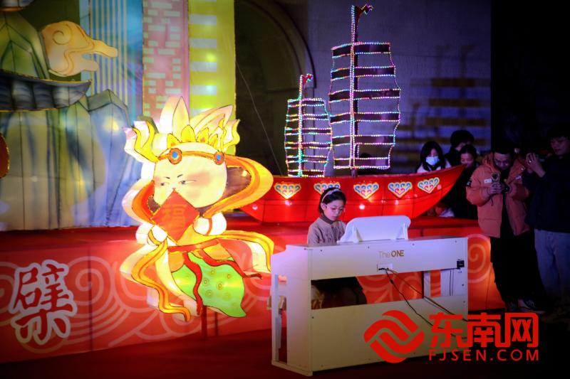 漁溪鎮(zhèn)“鋼琴獨奏”表演(東南網(wǎng)福清頻道元宵花燈采編組 攝) 黃檗山萬福寺的左側是可愛的“寶仔丸”和滿枝碩果的龍眼樹,邀請遠方的客人們品嘗“果中神品”“南方人參”滋味。眾所周知,漁溪素有“龍眼之鄉(xiāng)”的美譽,龍眼栽培歷史悠久,始于北宋,距今已有一千多年。它的右側有拔地而起的一座座建筑,正是新漁溪小城鎮(zhèn)建設活力無限的縮影。