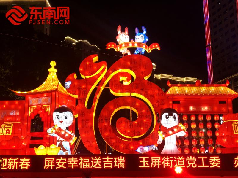在燈組上,“福”字兩側矗立著一男一女,分別為“阿玉”“阿屏”,二人手持“玉兔呈祥、屏安幸福”藏頭對聯,寓意新年送新福。