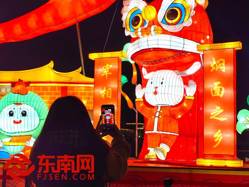 游客在港頭鎮花燈前拍“兔子舞獅”(東南網福清頻道元宵花燈采編組 攝)