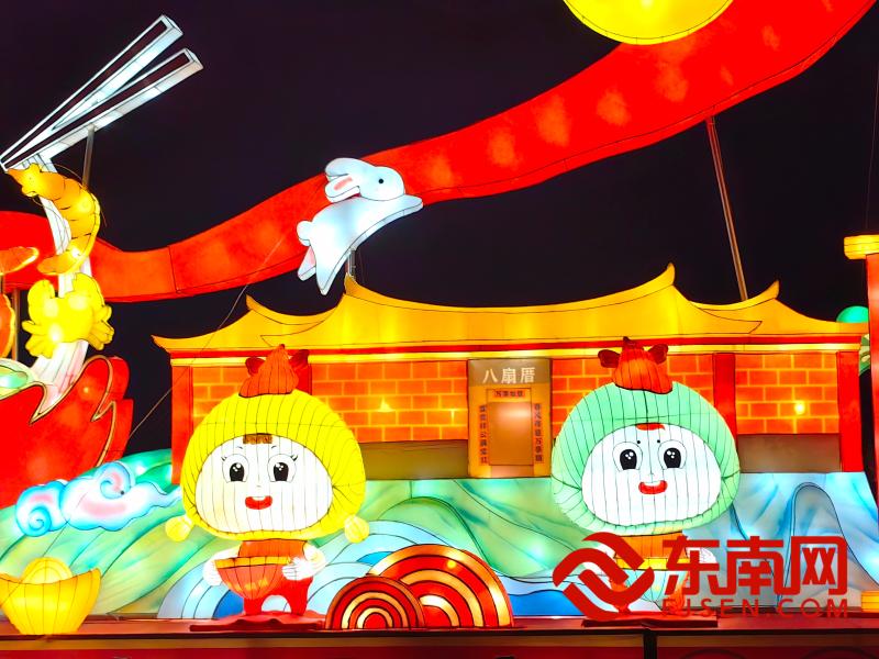 港頭鎮花燈局部“港港”和八扇厝(東南網福清頻道元宵花燈采編組 攝) “港港”的背后是港頭鎮著名的八扇厝,這個有著近300年歷史的古厝曾繁衍14代、160多戶人,它的每一個角落都留下人聲足跡。整個花燈在細節上還輔以圓月、舞獅、白兔、浪花、彩扇等春節裝飾,營造元宵喜慶氣氛。