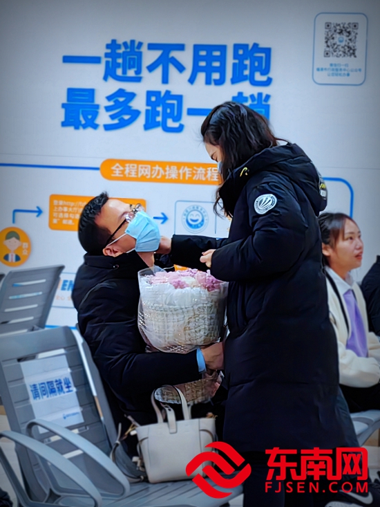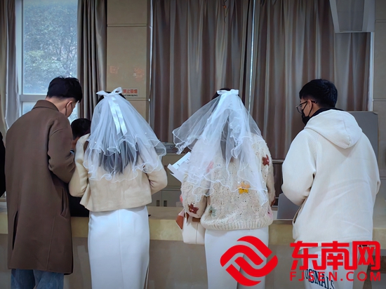 新人排隊領取現場號等候登記(東南網福清站記者 俞雅萍 攝) “我們8點10分就到崗,8點30分開始發放現場預約號。”福清市婚姻登記處的工作人員告訴記者,前來辦理婚姻登記的新人或手捧鮮花,或頭戴白紗,現場還有志愿者特意準備了喜糖和玫瑰贈予新人,儀式感十足。在工作人員的指引下,新人們有序辦理業務,抬眼可見的燦爛幸福笑容也為今日低溫陰雨的天氣,增添了些許暖意。