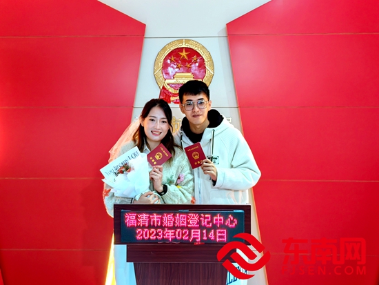 注冊登記結婚(東南網福清站記者 俞雅萍 攝) “我們之前是同事,認識了有4年多,后來兜兜轉轉兩個人走到一起,朝夕相處的陪伴我們很確定彼此就是那個可以攜手到老的人!”李先生感慨說道,他和女友終于在今天這個充滿愛意的日子成為合法夫妻。“從女友到妻子,身份的轉換,也意味著更多的責任,希望未來兩人繼續攜手共進!”身穿白色連衣裙、頭戴白紗的蔡女士亦告訴記者,為了這件“人生大事”,他們早早地就出門,從同事到戀人,再到今天如愿注冊登記結婚,感覺像一場夢。