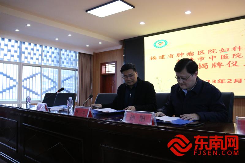 簽署“醫(yī)聯(lián)體”協(xié)議(福清市中醫(yī)院 供圖) 隨后,兩院院長(zhǎng)簽署關(guān)于福清市醫(yī)院和福建省腫瘤醫(yī)院“醫(yī)聯(lián)體”的協(xié)議。