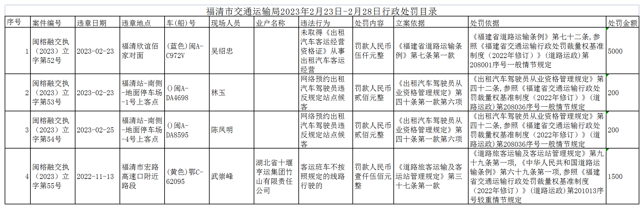 東南網福清3月3日訊(本網記者 鄭夢婷)近日,福清市交通管理局公開今年2月23日至2月28日行政處罰情況,3個人和1企業因存在交通違法事實被行政處罰,共處罰金6900元。 據了解,因未取得《出租汽車客運經營資格證》從事出租汽車客運經營、網絡預約出租汽車駕駛員違反規定站點候客、客運班車不按照規定的線路行駛等交通違法事實,吳紹忠、林玉、陳鳳明及湖北省十堰亨運集團竹山有限責任公司武崇峰被處以行政處罰。 具體公示行政處罰情況如下: