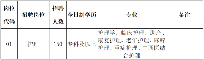 因醫(yī)院發(fā)展、規(guī)模擴張,人力資源儲備及梯隊建設需要,我院擬向社會公開招聘編外人員150名,實行合同制聘用。如下方案: 基本條件 1.遵紀守法,品行端正,愛崗敬業(yè),具有良好的思想教育和職業(yè)道德,在校或工作期間未受過任何處分。 2.五官端正,身體健康,能勝任崗位,體檢符合衛(wèi)生行業(yè)相關規(guī)定。18周歲以上,年齡的計算截止日期為報名第一天。 3.符合招聘崗位資格條件。 招聘崗位及要求 1.招聘崗位