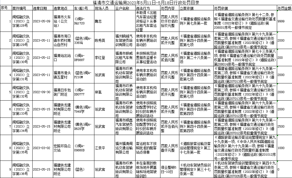 東南網(wǎng)福清5月23日訊(本網(wǎng)記者 鄭夢(mèng)婷)近日,福清市交通運(yùn)輸局公開(kāi)今年5月11日至5月18日行政處罰情況,1個(gè)人和8家企業(yè)因存在交通違法事實(shí)被行政處罰,共除罰金22498元。 據(jù)了解,因使用非本機(jī)構(gòu)車輛開(kāi)展培訓(xùn)活動(dòng)、未按照規(guī)范放置服務(wù)監(jiān)督卡從事經(jīng)營(yíng)活動(dòng)、未取得《網(wǎng)絡(luò)預(yù)約出租汽車運(yùn)輸證》擅自從事網(wǎng)約車經(jīng)營(yíng)活動(dòng)等交通違法事實(shí),福州曉峰汽車駕駛員培訓(xùn)有限公司、福清市驊威出租汽車有限公司、魏志等共計(jì)9家(名)企業(yè)及個(gè)人被處以交通行政處罰。 具體處罰公示如下: