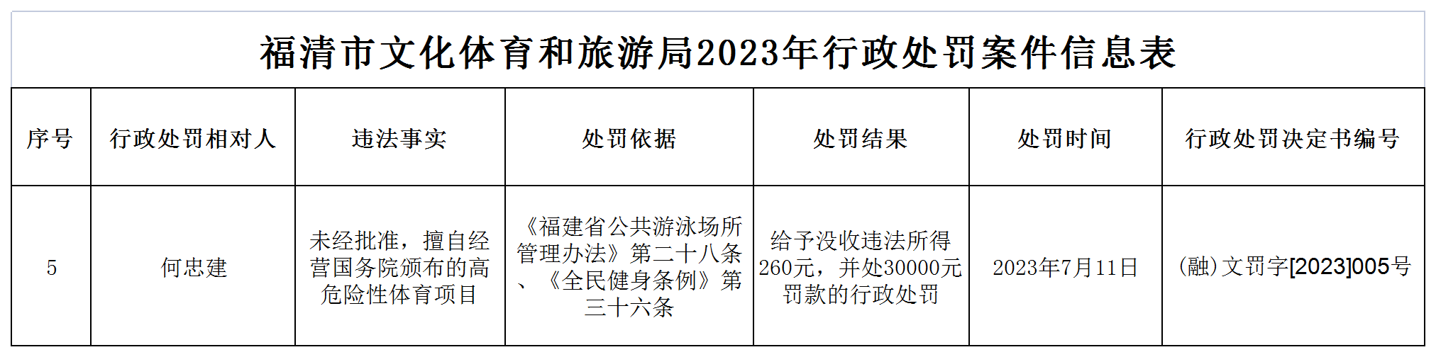 東南網福清7月14日訊(本網記者 鄭夢婷)近日,福清市文化體育和旅游局公開今年第5號行政處罰情況。因未經批準,擅自經營國務院頒布的高危險性體育項目的違法事實,當事人何忠建日前被處以行政處罰,沒收違法所得260元,并處罰金3萬元。 具體信息如下: