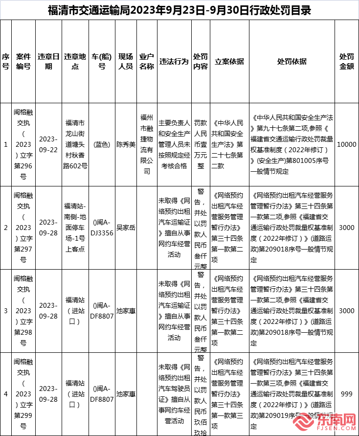 - [10-10] 福清公布4起交通行政處罰案例 最高罰款1萬元
