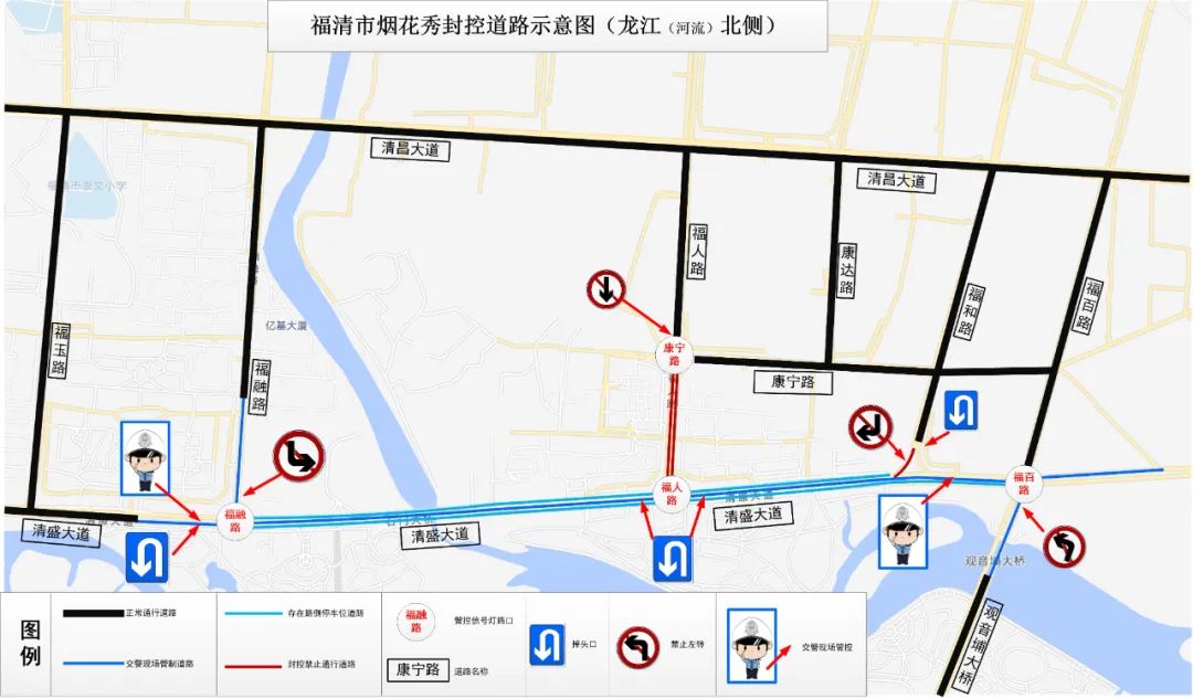 關于福清市元旦焰火晚會活動期間 周邊道路實行臨時交通管制的通告 福清市元旦焰火晚會活動將于12月31日晚(星期二)在福清市龍江兩岸舉辦。為確保活動安全順利進行,保障道路交通安全、有序、暢通,根據《中華人民共和國道路交通安全法》第三十九條規定,決定對以下道路實行臨時交通管制,現通告如下: 一、清盛大道、福人路 19:00至21:00,將對清盛大道(福融路至福和路)、福人路(康寧路至清盛大道)實行臨時交通管制,將清盛大道(福融路至福百路)路段設置為臨時停車區域。
