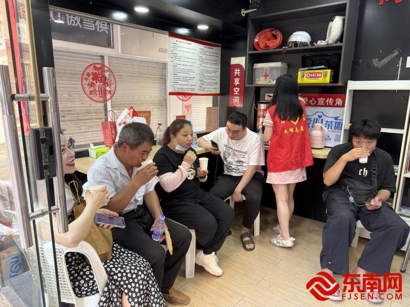 高考期間,福清玉屏街道步行街社區(qū)志愿者在僑中考點(diǎn)附近的成龍步行街戶外勞動(dòng)者服務(wù)點(diǎn)設(shè)立家長(zhǎng)休憩區(qū),為等候家長(zhǎng)營(yíng)造舒適便捷的候考環(huán)境。(東南網(wǎng)福清頻道記者 陳小琴攝)