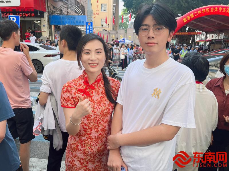 福清第二中學(xué)考點(diǎn)外,考生家屬身穿旗袍與考生合影。(東南網(wǎng)福清頻道 實(shí)習(xí)生 蔡雅萍攝)