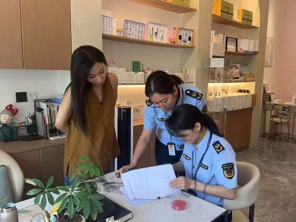 檢查現(xiàn)場(福清市監(jiān)局供圖) 此外,針對暑期旅游高峰,執(zhí)法人員以旅游景區(qū)餐飲單位、連鎖品牌店為切入點(diǎn),向同類型餐飲店及夜市、大排檔等夏季消費(fèi)熱點(diǎn)場所輻射拓展,嚴(yán)格依據(jù)“四查四看”標(biāo)準(zhǔn)(查資質(zhì)看合法性、查來源看追溯性、查操作看規(guī)范性、查環(huán)境看衛(wèi)生狀況)開展“解剖式”檢查。截至目前,共出動(dòng)執(zhí)法人員162人次,檢查各類單位459家次,責(zé)令改正19家,立案查處21家。 藥械化安全:日常監(jiān)管+專項(xiàng)整治,規(guī)范市場秩序 在藥械化監(jiān)管領(lǐng)域,福清市市場監(jiān)管局堅(jiān)持“日常監(jiān)管+專項(xiàng)整治”雙管齊下,筑牢健康防護(hù)墻。一方面,強(qiáng)化常態(tài)化巡查與抽檢力度,對藥店、醫(yī)療器械經(jīng)營企業(yè)和化妝品店等單位開展暑期監(jiān)督檢查。7月1日至8月25日期間,完成暑期藥品抽檢13批次,檢查相關(guān)單位110家次,立案查處藥械化類案件22起。
